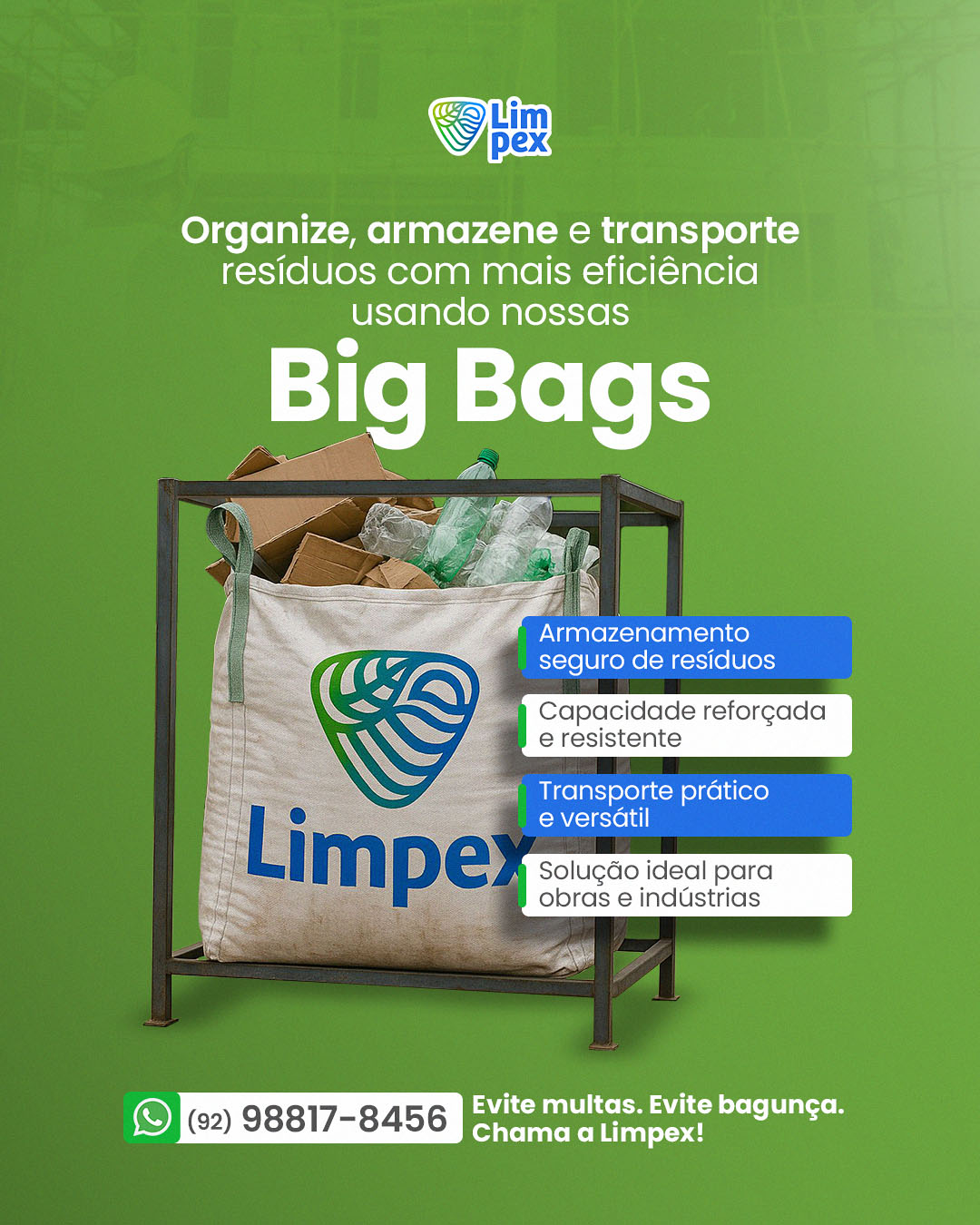 A Limpex, desde 1994, é referência em Manaus na locação de Big Bags para papel, papelão, plástico e resíduos recicláveis. Atendemos empresas, condomínios e comércios que precisam de uma solução prática e segura para armazenamento e transporte de materiais recicláveis. Oferecemos Big Bags resistentes e de alta capacidade, ideais para coleta seletiva e logística reversa. Trabalhamos com locação rápida e retirada programada, garantindo o descarte correto e sustentável dos resíduos. Se você busca Big Bags para reciclagem em Manaus, conte com a Limpex — tradição, eficiência e compromisso com o meio ambiente há mais de 30 anos.